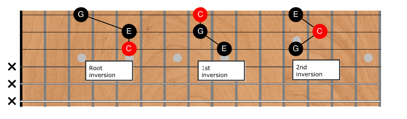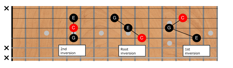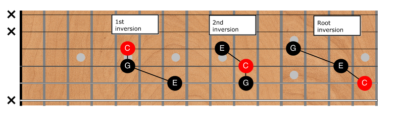 On the top three strings of the guitar, the three close voicings of the C Major triad are played as follows: