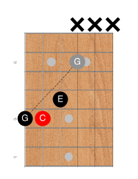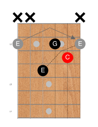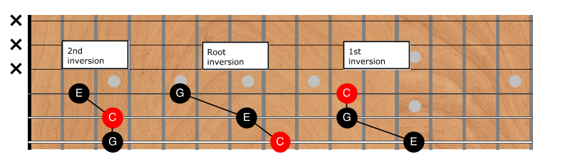 The same thing occurs going from first to second inversion: EGC → GCE. And again when repeating the next higher root inversion (at frets 15-17 if you can reach): GCE → CEG.