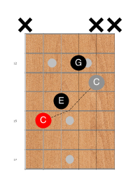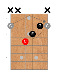 The root position dropped all the way down to the note C at the 8th fret of the low E string. The 1st inversion of C Major on the top strings is also at the 8th fret. So move the C over onto the same fret of the high E and start dropping the 1st inversion shape down the strings: