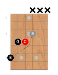 The same thing occurs going from first to second inversion: EGC → GCE. And again when repeating the next higher root inversion (at frets 15-17 if you can reach): GCE → CEG.